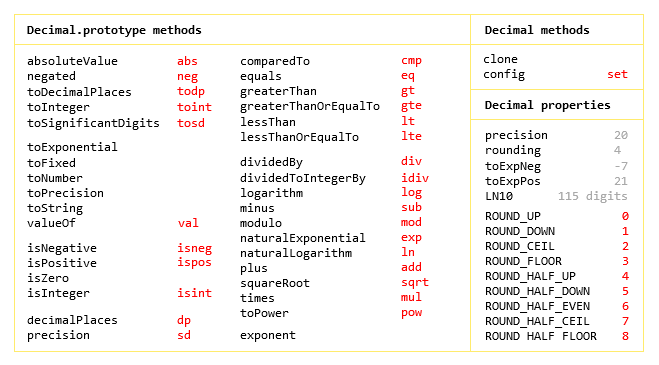 x.dividedBy(y).toDecimalPlaces(19).toString(); // '0.6666666666666666667'The naturalExponential, naturalLogarithm, logarithm, and toPower methods in this library have by default a limited precision of around 100 digits. This limit can be increased at runtime using the LN10 (the natural logarithm of ten) configuration object property.